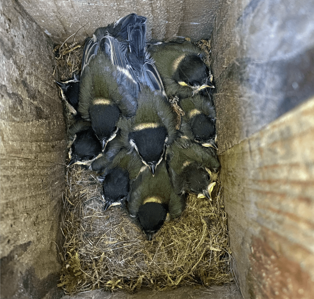 Nest boxes are occupied in spring and summer by breeding songbirds, primarily great tits, blue tits and pied flycatchers, with the occasional common redstart. In colder months our boxes are also used by great and blue tits for roosting. We measure various breeding behaviours, timing of breeding and breeding success.